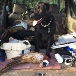 JH: Dog person, as the photo of Buck, my beautiful black Lab, demonstrates. No cat could have found, pointed, and retrieved that pheasant. Which was delicious, by the way.