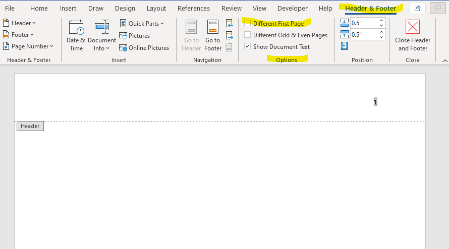 In MS Word, make sure the document header is visible. Double-click anywhere in the header, and the Header and Footer menu will appear in the ribbon. In the Options section, check the box for Different First Page. The page number on the first page will disappear. (The page is numbered; you just can’t see it.) Check out the other options while you’re at it.