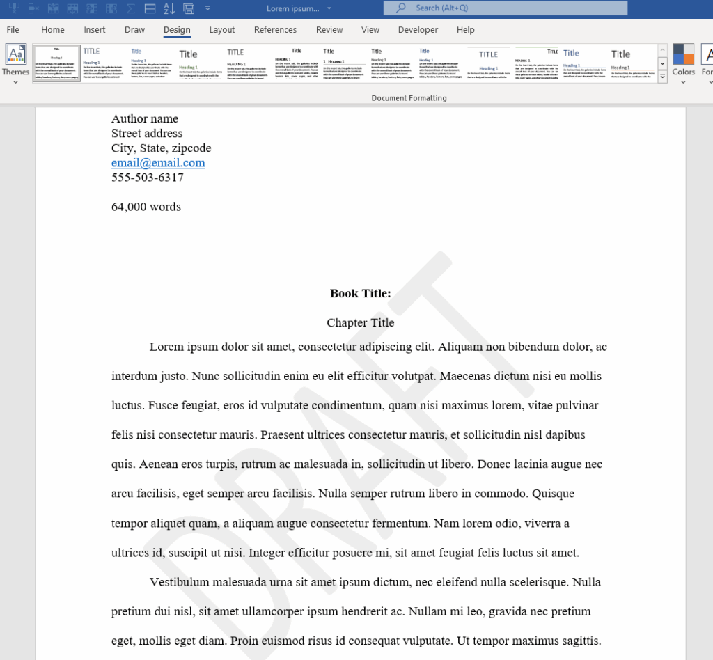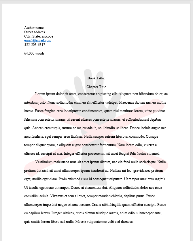 TIP: When you submit a manuscript to an agent or editor, the pages should be free of watermarks, copyrights, and other disclaimers implying that you don’t trust the reader with your work—not cool. Watermarks can be annoying in any case, so be sure to consider the reader. And don’t forget: Anyone who knows how to search online can probably remove your watermark.