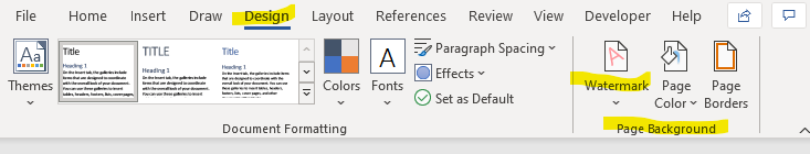 To make a watermark in MS Word, go to the Design menu and choose Watermark in the Page Background section.